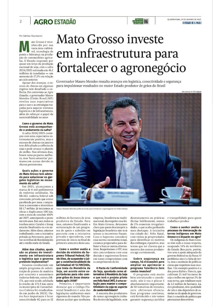 Em entrevista ao jornal, o governador Mauro Mendes falou das perspectivas da produção para este ano e também sobre a moratória da soja.