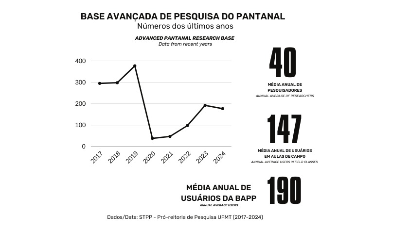 Ao longo de quase 20 anos de existência, a Base Avançada de Pesquisa do Pantanal se consolidou como um pilar fundamental para o desenvolvimento científico no estado. Segundo dados da Supervisão Técnica de Projetos de Pesquisa (STPP/PROPeq) entre 2017 e 2024, a base recebeu, em média, 190 usuários por ano. Esse número foi impactado em 2020 pela pandemia de COVID-19, quando o atendimento foi suspenso para garantir o distanciamento social.