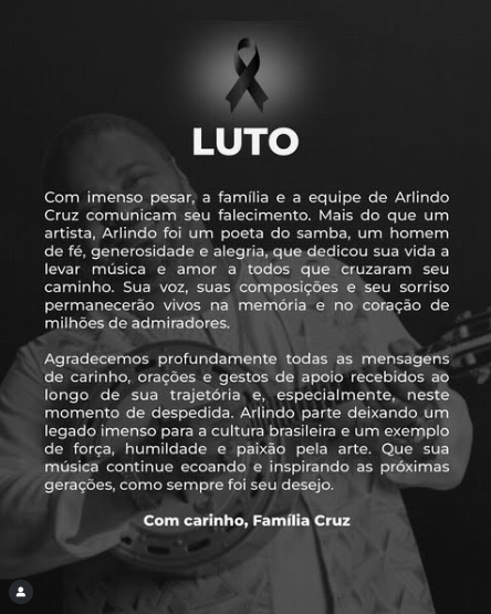 A notícia foi confirmada pela família por meio das redes sociais do artista. “Com imenso pesar, a família e a equipe de Arlindo Cruz comunicam seu falecimento. Mais do que um artista, Arlindo foi um poeta do samba, um homem de fé, generosidade e alegria, que dedicou sua vida a levar música e amor a todos que cruzaram seu caminho”, diz a nota oficial.