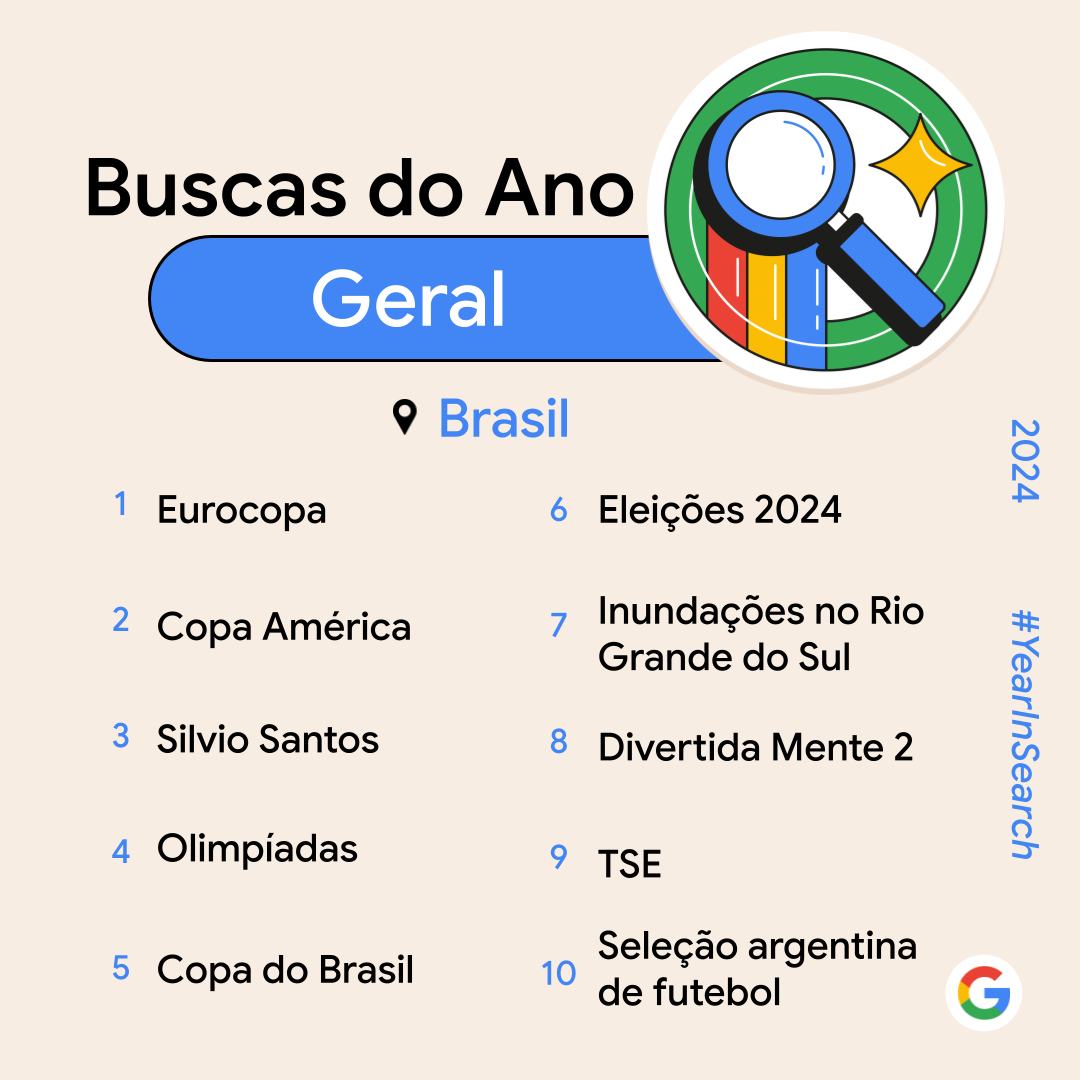 Neste ano, o futebol dominou as buscas no Google e os campeonatos Eurocopa e Copa América ficaram em 1º e 2º lugar, respectivamente, nos assuntos no topo do ranking geral, que reúne os temas que mais geraram interesse entre os brasileiros no período. A morte de do apresentador Silvio Santos também causou comoção entre os brasileiros e as homenagens a ele ganharam repercussão no Brasil e no mundo.