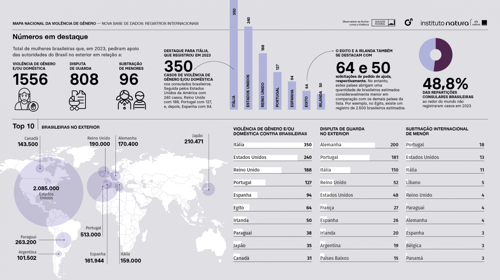 Os dados ainda revelam um ranking com os números de atendimentos registrados por país, que leva em consideração os países com as maiores comunidades de brasileiras, com destaque para a Itália, que no ano de 2023, registrou 350 casos de violência de gênero nos consulados brasileiros. Seguida pelos Estados Unidos da América com 240 casos, Reino Unido com 188, Portugal com 127, e, depois, Espanha com 94.