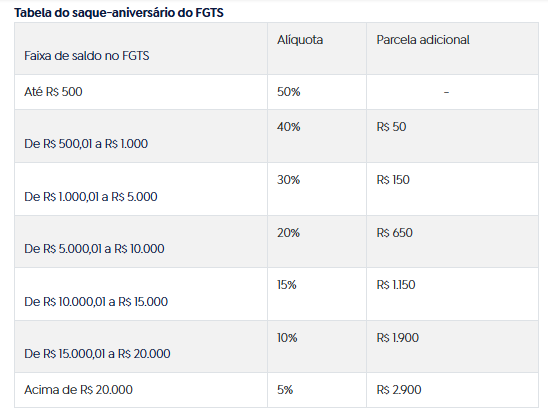O valor liberado depende do saldo existente nas contas do FGTS. A tabela é progressiva, com alíquotas que variam de 5% a 50%, acrescidas de uma parcela fixa adicional.