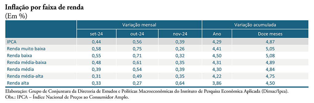Na comparação com novembro de 2023, os dados mostram que houve aceleração da inflação corrente para todas as faixas de renda, com pressão inflacionária mais intensa para os segmentos de renda média. A aceleração da inflação corrente para as classes de renda mais baixa é explicada, em grande parte, pela piora no desempenho do grupo "alimentação e bebidas", uma vez que as variações de preços das carnes (1,4%), aves e ovos (0,53%) e óleos e gorduras (1,3%), apontadas em 2023, avançaram para altas respectivas de 8%, 1,4% e 6%, em 2024.