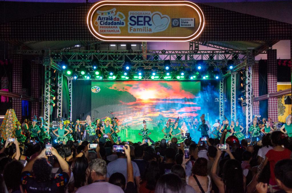 A primeira noite do Arraiá da Cidadania levou mais de 10 mil pessoas à Arena Pantanal, em Cuiabá, nesta sexta-feira (25.7), com atrações culturais, estrutura inclusiva, parque de diversões e serviços essenciais ofertados gratuitamente à população. A abertura oficial do evento, idealizado pela primeira-dama Virginia Mendes e executado pela Secretaria de Estado de Assistência Social e Cidadania (Setasc), contou com apresentação do premiado grupo Flor Ribeirinha e da dupla sertaneja Cleber e Cauan.