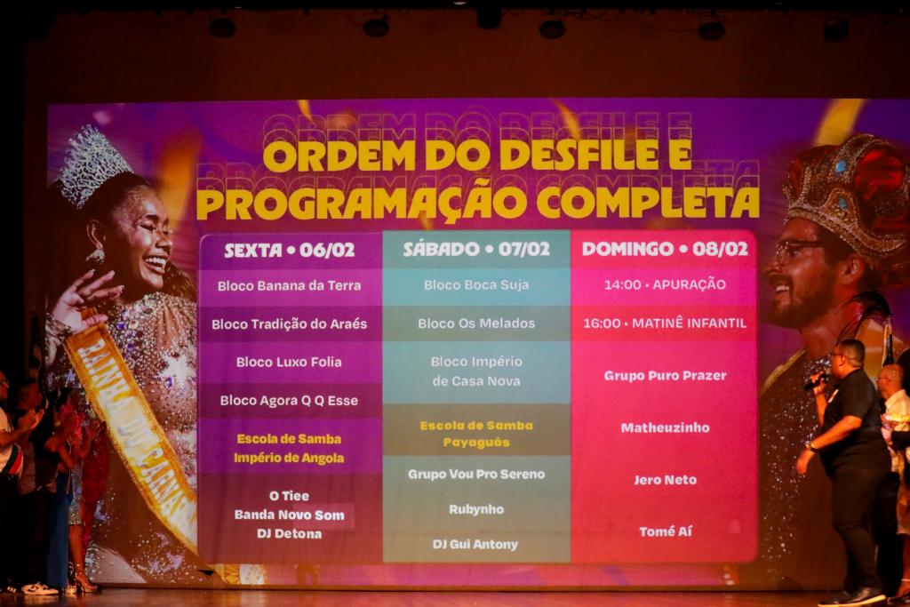 Conforme a programação divulgada no lançamento, na sexta (6.2) desfilam Bloco Banana da Terra, Bloco Tradição do Araés, Bloco Luxo Folia, Bloco Agora QQ Esse, Escola de Samba Império de Angola, além de atrações como O Tiee, Banda Novo Som, DJ Detona.
