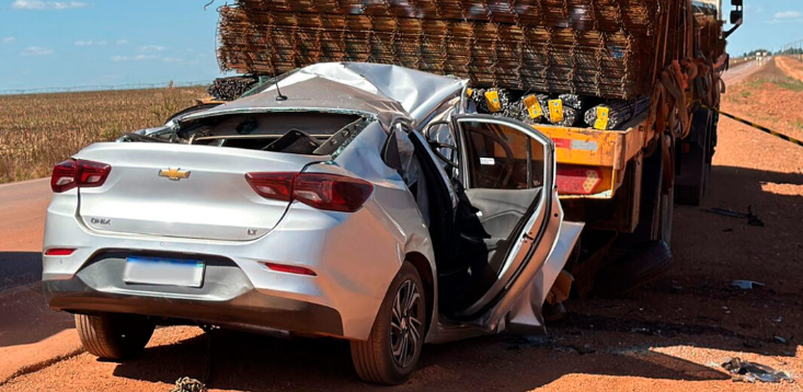 Vítima dirigia um GM Ônix e bateu na traseira do veículo de carga; impacto foi tão forte que peças do carro atingiram o caminhoneiro, que teve uma perna ferida
