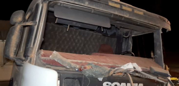 A carreta teve danos severos na parte frontal, com marcas de sangue visíveis na cabine e na porta do lado esquerdo. A Polícia Militar esteve no local para registro da ocorrência e investigação das causas do acidente. As circunstâncias do ocorrido ainda serão apuradas pelas autoridades competentes.
