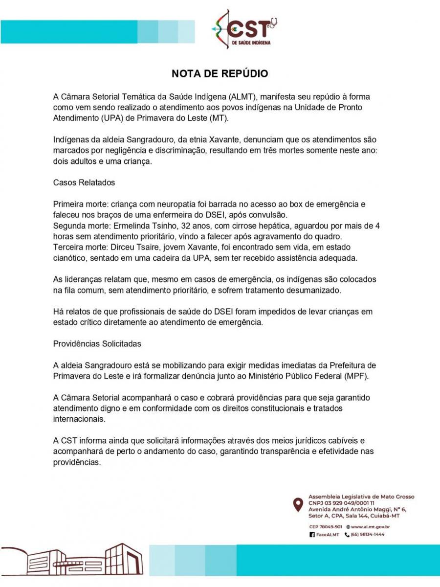 De acordo com a nota, indígenas da aldeia Sangradouro, da etnia Xavante, denunciam que os atendimentos são marcados por negligência e discriminação, resultando em três mortes somente neste ano — dois adultos e uma criança.
