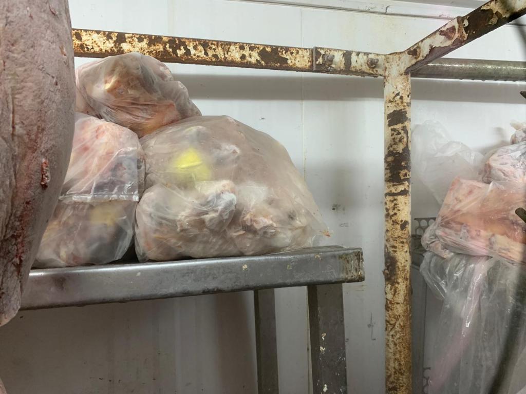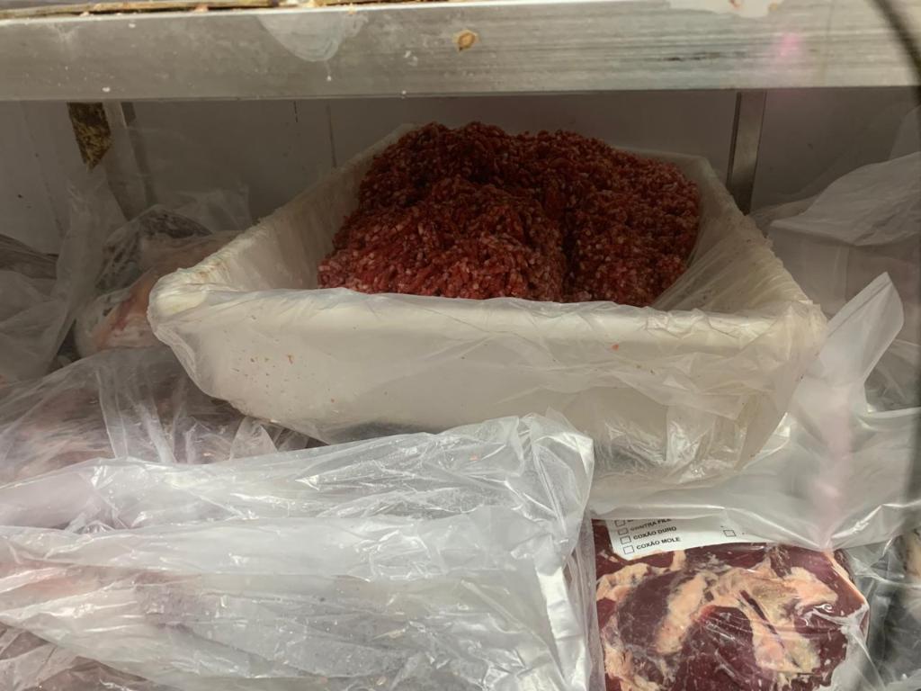 Nos fundos, havia esgoto correndo a céu aberto, ausência de produtos para higienização das mãos dos funcionários, inexistência de local adequado para guardar pertences pessoais, além de condições precárias na câmara fria, onde carnes eram armazenadas em contato com o chão.