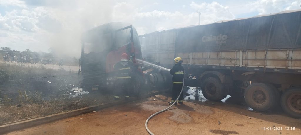 Carreta pega fogo após colisão com poste e mobiliza bombeiros em Alta Floresta