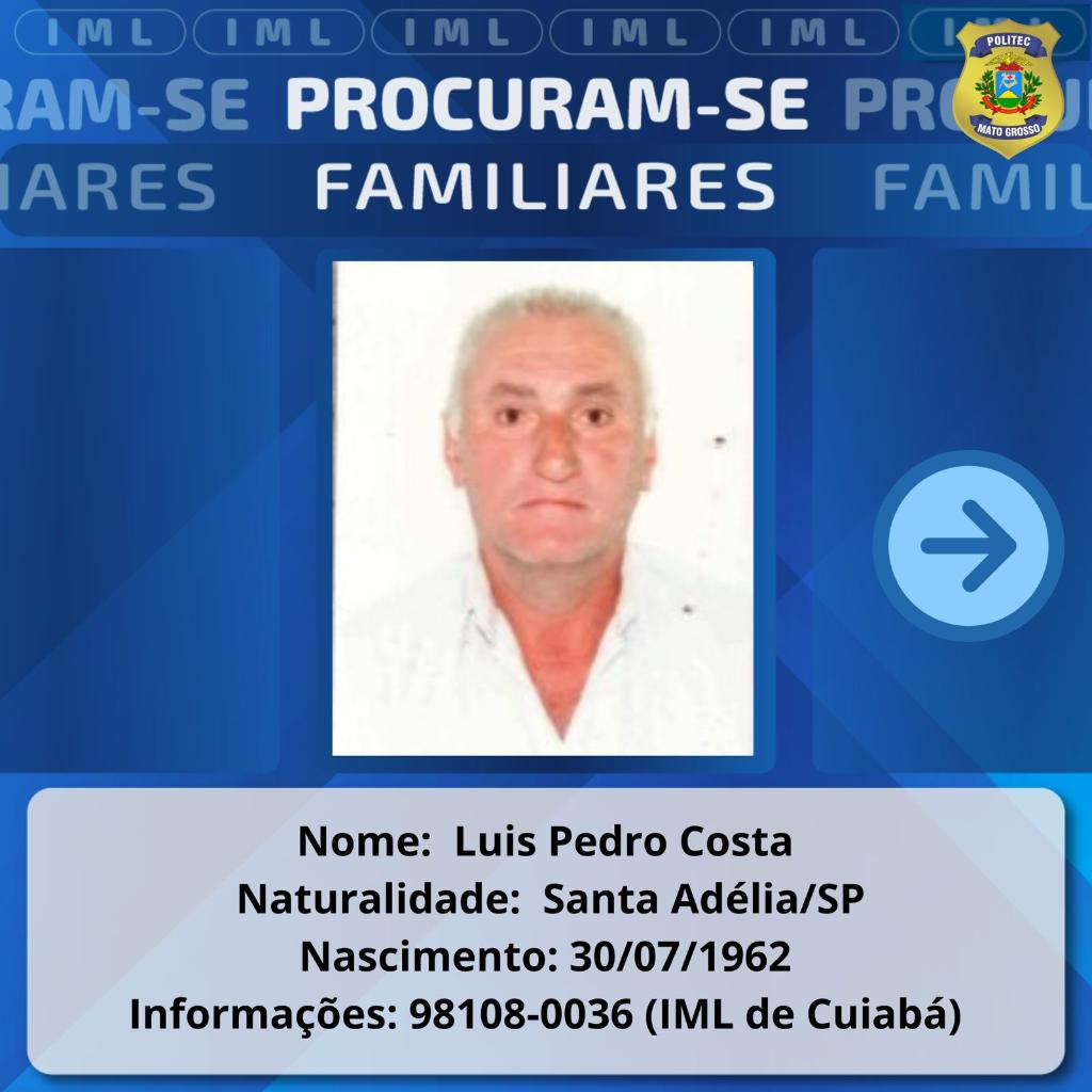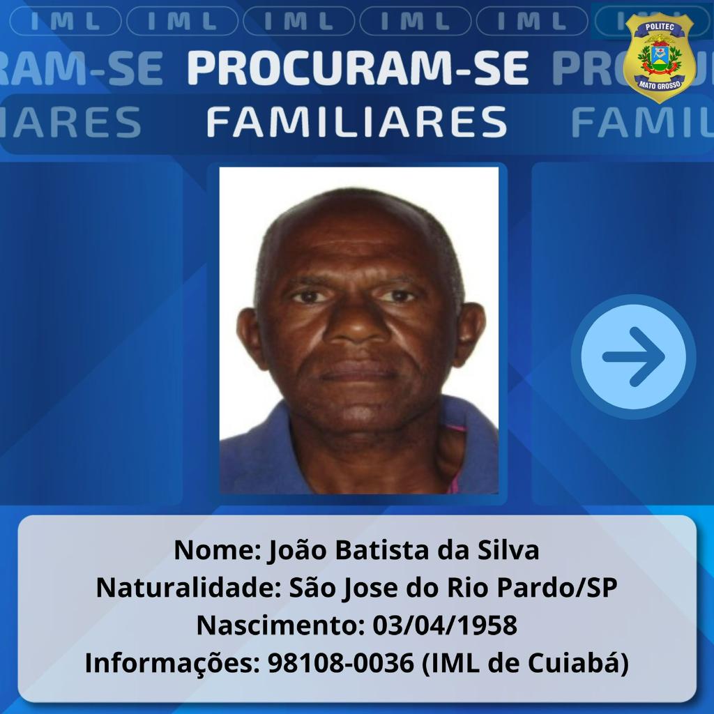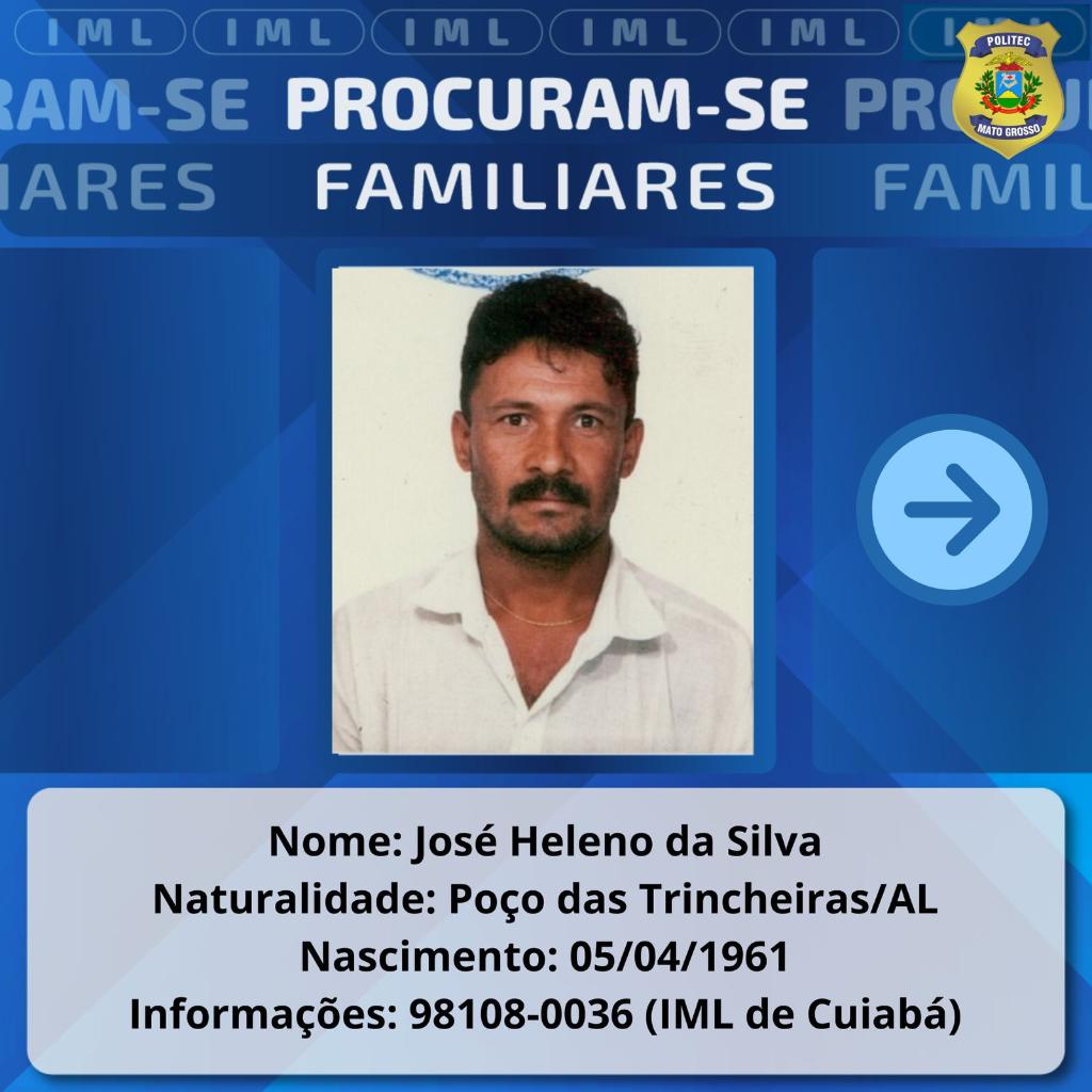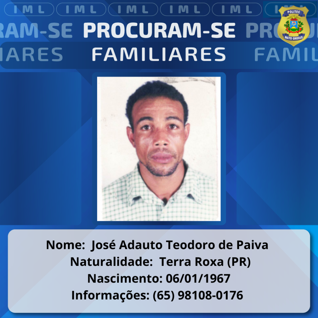 A Politec também procura por familiares de um homem identificado como José Adauto Teodoro de Paiva, que faleceu no dia 7 de junho de 2025, em Nova Mutum.