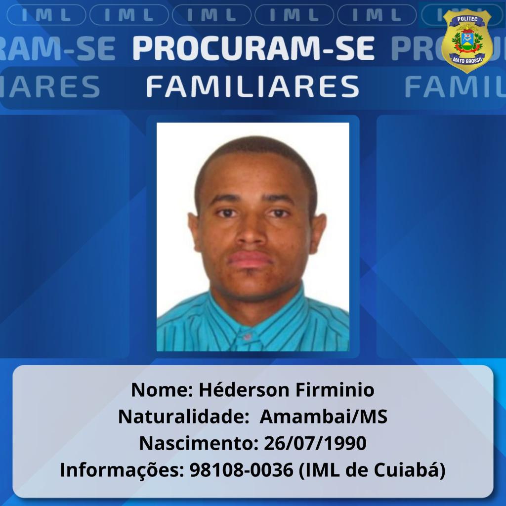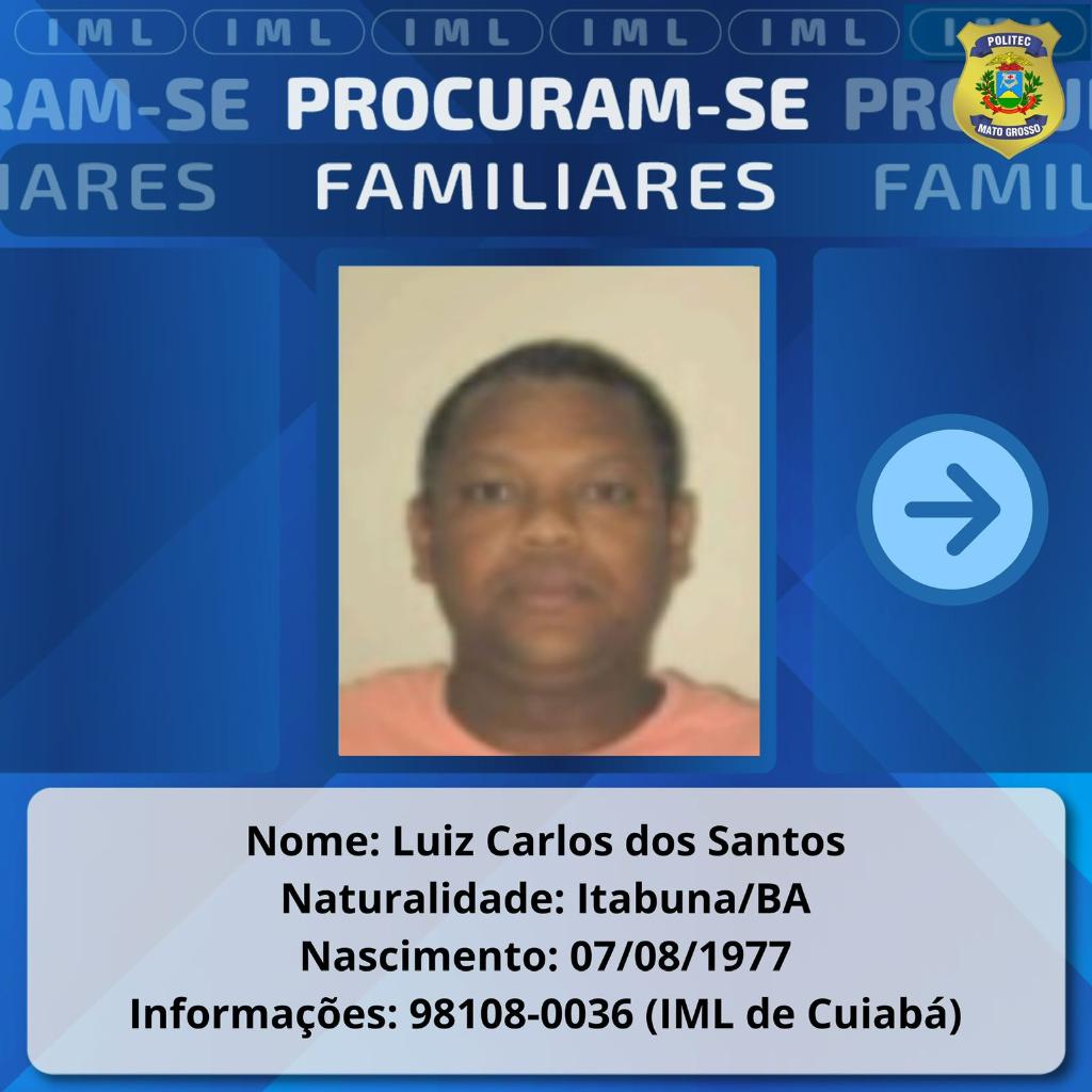 São procurados os familiares de Luiz Carlos dos Santos, nascido em 07/08/1977, em Itabuna (BA). Ele foi encontrado morto na Rodoviária de Cuiabá, em abril deste ano.