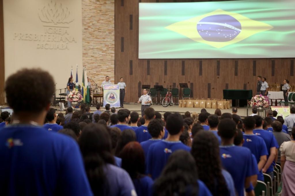 O Programa Educacional de Enfretamento e Repressão às Drogas e Violência (Proerd), vinculado à Polícia Militar de Mato Grosso (PMMT), realizou, na manhã desta segunda-feira (23.6), a cerimônia de formatura de mais de mil alunos do 7º, 8º e 9º ano do Ensino Fundamental e 1º ano do Ensino Médio. A solenidade ocorreu na Igreja Presbiteriana Central de Cuiabá.