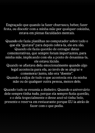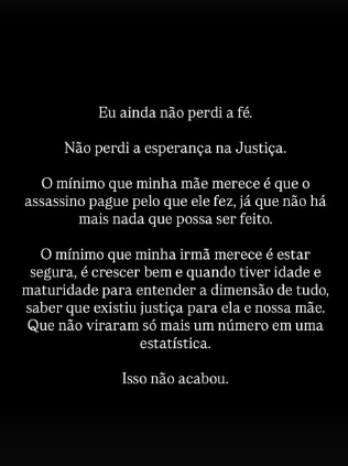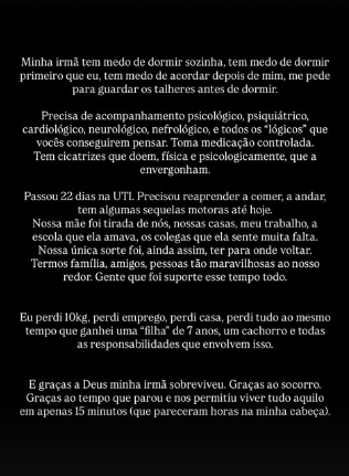 “Como que alguém faz tudo aquilo e dizem que ele não sabia o que estava fazendo?”, escreveu. Em outro trecho, desabafou: “Para nós isso não acabou. Minha mãe não volta e minha irmã luta todos os dias para se recuperar. A dor continua aqui.”