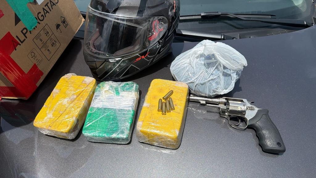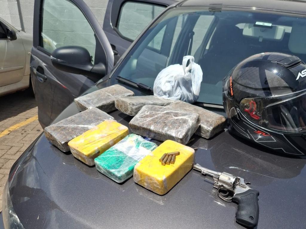 Com eles, os policiais apreenderam cinco tabletes de maconha, três tabletes de pasta base, uma sacola com pasta base em pó, uma bolsa com resquícios de pasta base, um revólver e mais cinco munições intactas, além do veículo Fiat Mobi e os celulares dos suspeitos.